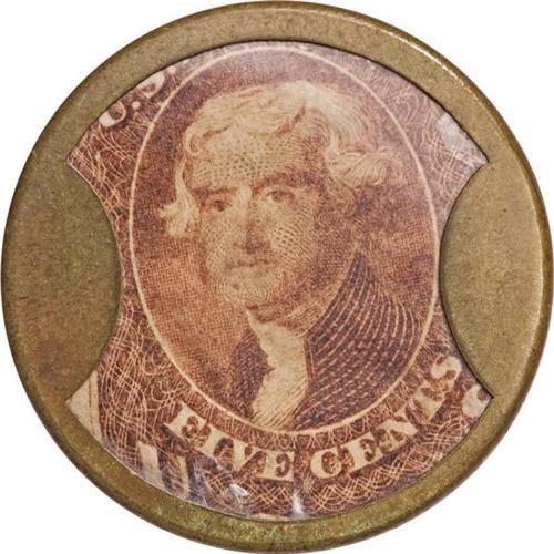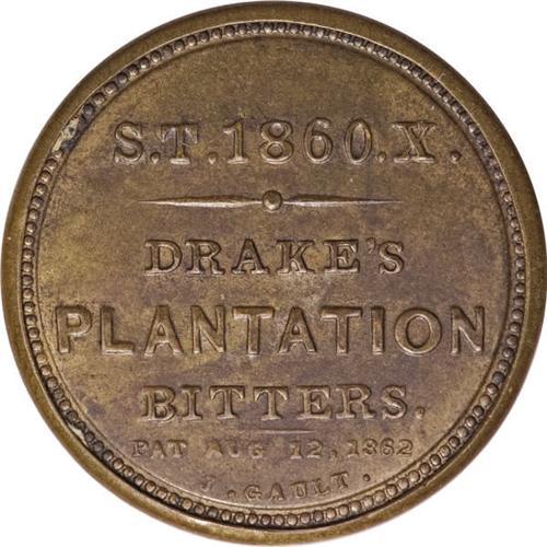 <B>HB-102 EP-74 Scott-72 Reed-DR05 5¢ Drake's Plantation Bitters About New.<BR>Numerical grade: 80case.75stamp.70mica. = 225</B></I> The case is a gorgeous golden brown, without a hint of a defect. The stamp is fresh, but with a few minor ripples, and the mica is crystal clear over most all of its surface, with a few minor crazes at the lower left. A relatively scarce piece, with about 25 examples known of this denomination.<BR><I>From The Frederick Mayer Collection</B></I><BR><BR><b>Shipping:</b> Coins & Currency (<a target="_blank" href="http://www.heritageauctions.com/common/shipping.php">view shipping information</a>)