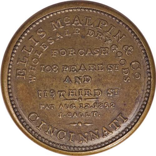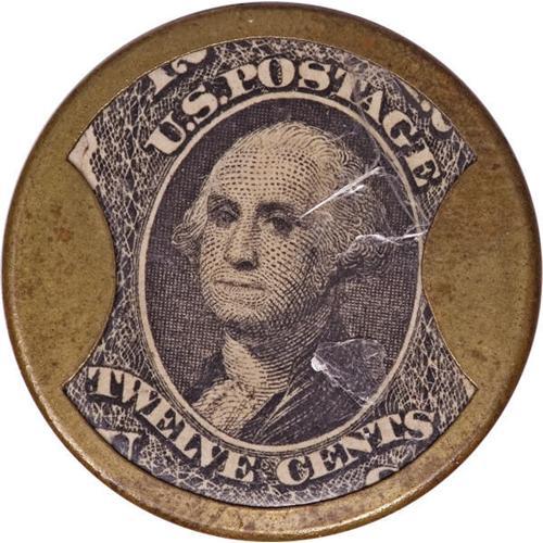 <B>HB-114 EP-146 Scott-82 Reed-EM12 12¢ Ellis McAlpin & Company About New.<BR>Numerical grade: 80case.80stamp.60mica. = 220</B></I> A beautiful and very rare piece. Reed's auction survey shows only thirteen examples, including heavy duplication. His rarity rating of R-9 indicates two to four known. The Hodder-Bowers reference feels "Two or three," and the Stack's June 2004 catalog, which offered two pieces, stated, "Four or five." We believe four is the correct number. This one is a beauty, with a glossy, medium brown high-end case that shows virtually no circulation. The stamp is as nice as any Twelve Cent we've seen. The mica is clear, but it has two areas of minor crazing: one in Washington's hair and the second on his shoulder.<BR><I>From The Frederick Mayer Collection</B></I><BR><BR><b>Shipping:</b> Coins & Currency (<a target="_blank" href="http://www.heritageauctions.com/common/shipping.php">view shipping information</a>)