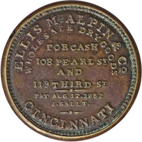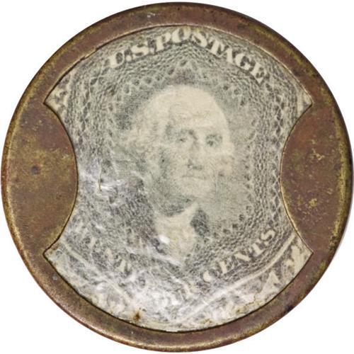 <B>HB-115 EP-166 Scott-83</B></I> <B>Reed-EM24 24¢ Ellis McAlpin & Company Very Fine.<BR>Numerical grade: 60case.65stamp.65mica. = 190</B></I> Surprisingly, the 24¢ is one of the most common denominations for this merchant. Reed shows 24 auction appearances in his 104-year survey period, and considers it to be an R-8, with five to ten examples known. The Stack's June 2004 catalog considers the piece "Ten to a dozen," and we tend to agree. It is actually one of the more available of the 24¢ encasements. The case is quite dark, with minor corrosion at the seam. The mica is clear, but with a number of surface marks, and the stamp is toned down.<BR><I>From The Frederick Mayer Collection</B></I><BR><BR><b>Shipping:</b> Coins & Currency (<a target="_blank" href="http://www.heritageauctions.com/common/shipping.php">view shipping information</a>)