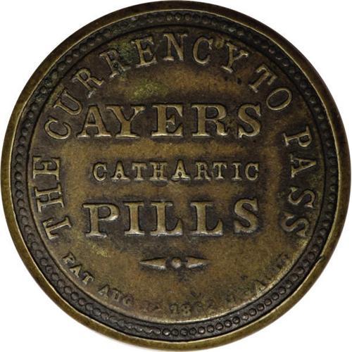 <B>HB-13 EP-159b Scott-7 Reed-AC24SA 24c Ayer's Cathartic Pills Short Arrows Very Fine.</B></I><BR> An extremely rare piece considered unique by Mr. Mayer when it was purchased and listed as an R-10 (unique) in Reed. There is, however, a second piece which was in Stack's June 2004 sale. This piece has an essentially perfect case, with medium brown toning that is darker behind the letters. The stamp is fresh, but a little difficult to focus on as the mica is somewhat hazy due to multiple surface marks and separation among its layers.<BR><I>From The Frederick R. Mayer Collection</B></I><BR><BR><b>Shipping:</b> Coins & Currency (<a target="_blank" href="http://www.heritageauctions.com/common/shipping.php">view shipping information</a>)