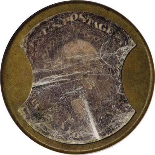 <B>HB-13 EP-159b Scott-7 Reed-AC24SA 24¢ Ayer's Cathartic Pills Short Arrows Very Fine.<BR>Numerical grade: 80case.40stamp.50mica. = 170</B></I><BR> An extremely rare piece considered unique by Mr. Mayer when it was purchased and listed as an R-10 (unique) in Reed. There is, however, a second piece which was in Stack's June 2004 sale. This piece has an essentially perfect case, with medium brown toning that is darker behind the letters. The stamp is fresh, but a little difficult to focus on as the mica is somewhat hazy due to multiple surface marks and separation among its layers.<BR><I>From The Frederick Mayer Collection</B></I><BR><BR><b>Shipping:</b> Coins & Currency (<a target="_blank" href="http://www.heritageauctions.com/common/shipping.php">view shipping information</a>)