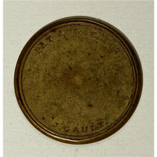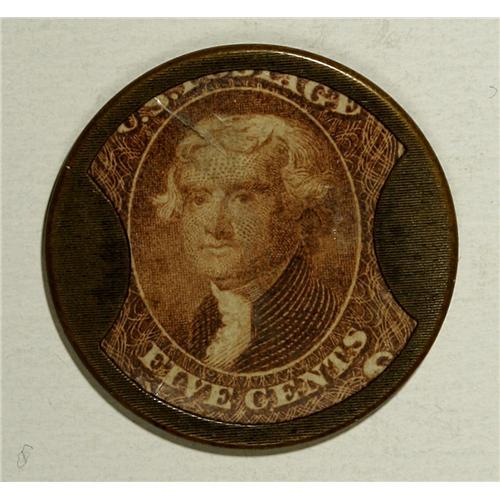 <B>HB-132 EP-79 5¢ J. Gault Ribbed Frame Extremely Fine.</B></I> A beautiful ribbed-frame piece with an ideal case, a perfectly centered, fully bright stamp and a mica that is flawless save for a single short crack at the upper left. If you are looking for a sole ribbed-frame variety to fill out your collection, this beauty would be a perfect piece.<BR><BR><b>Shipping:</b> Coin/Currency (<a target="_blank" href="http://www.heritageauctions.com/common/shipping.php">view shipping information</a>)