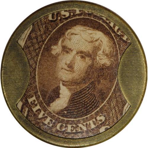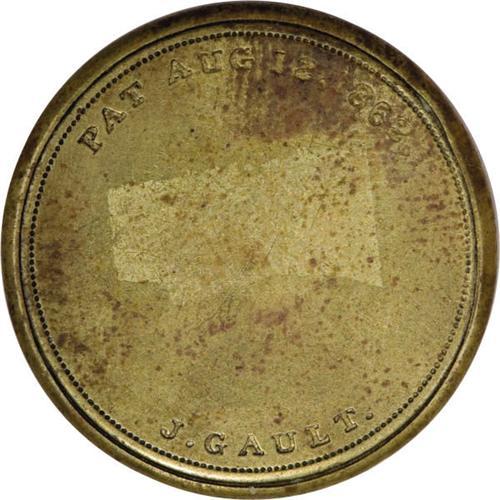 <B>HB-132 EP-79 Scott-96a Reed-JG05RB 5¢ J. Gault Ribbed Frame Extremely Fine.<BR>Numerical grade: 75case.85stamp.80mica. = 240</B></I> An unusually nice example of this Ribbed Frame Gault piece. The Five Cent Ribbed Gault is the most common of any of the ribbed-frame pieces. This example has a case that has a lighter stained area on the back. The stamp is flawless save for its centering, which is skewed, and the mica is extremely nice, with no mentionable faults.<BR><I>From The Frederick Mayer Collection</B></I><BR><BR><b>Shipping:</b> Coins & Currency (<a target="_blank" href="http://www.heritageauctions.com/common/shipping.php">view shipping information</a>)