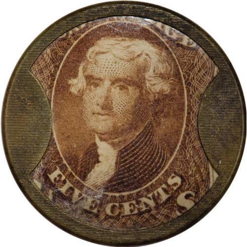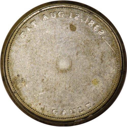 <B>HB-132 EP-79 Scott-96a Reed-JG05RB 5¢ J. Gault Ribbed Frame Choice About New.<BR>Numerical grade: 85case.80stamp.70mica. = 240</B></I> A beautiful example of the Ribbed Frame type. This piece has ninety-plus percent of its original silvering remaining. It's particularly unusual to find a Gault piece with this much silver. There are no raised letters on the backs of Gault pieces, and the letters did much to protect the silvering. On these plain-back Gault pieces, the silvering wore away almost immediately. Reed considers the Five Cent Ribbed Gault to be an R-4 (31-40 known), a number with which we pretty much agree. This number is the most common of any Ribbed Frame Encased Postage, which makes it an ideal example to represent the type. The case is pristine, the stamp beautifully fresh but centered a hair to the left, and the mica with the normal minor crazing at its edges.<BR><I>From The Frederick Mayer Collection</B></I><BR><BR><b>Shipping:</b> Coins & Currency (<a target="_blank" href="http://www.heritageauctions.com/common/shipping.php">view shipping information</a>)