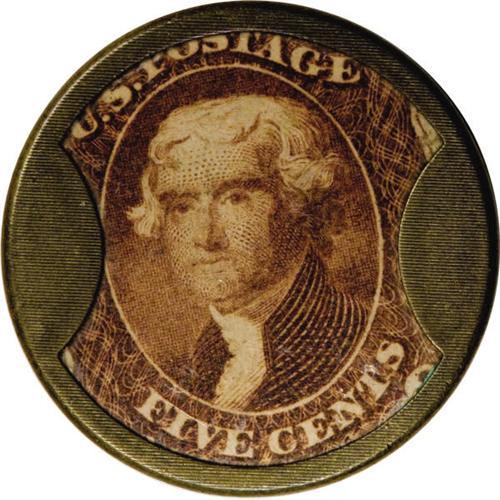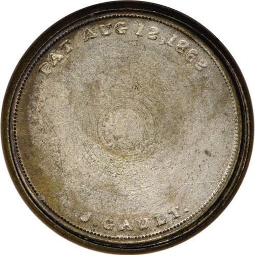 <B>HB-132 EP-79 Scott-96a ReedJG05RB 5¢ J. Gault Ribbed Frame About New.<BR>Numerical grade: 75case.80stamp.80mica. = 235</B></I> The case is a light brass color, with no defects. The stamp is well centered and very fresh, and the mica is clear, with none of the normal craze marks and just a few minor surface imperfections. A handsome piece, and a fine example of the Ribbed Frame type.<BR><I>From The Frederick Mayer Collection</B></I><BR><BR><b>Shipping:</b> Coins & Currency (<a target="_blank" href="http://www.heritageauctions.com/common/shipping.php">view shipping information</a>)