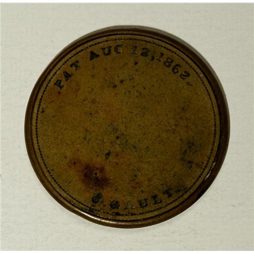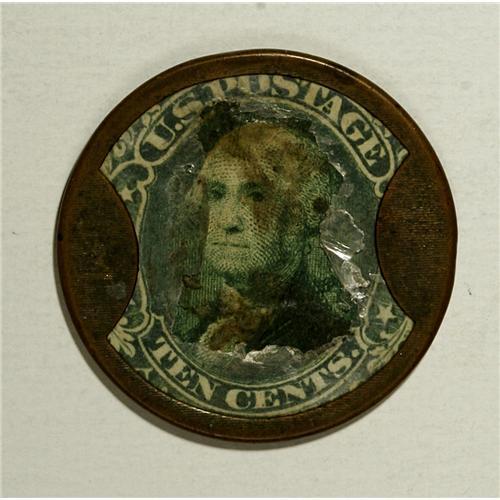<B>HB-134 EP-117 10¢ J. Gault - Ribbed Frame Very Fine.</B></I> A decent case, but the central portion of the mica is broken and missing exposing the stamp which is consequently quite soiled. An inexpensive representation of the much scarcer Ribbed Framed type.<BR><BR><b>Shipping:</b> Coin/Currency (<a target="_blank" href="http://www.heritageauctions.com/common/shipping.php">view shipping information</a>)