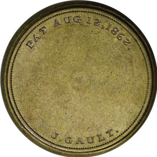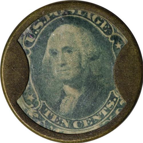 <B>HB-134 EP-117 10¢ J. Gault Ribbed Frame Extremely Fine.</B></I> This example is from the much scarcer Ribbed Frame variety. The outer edge of the encasement has a lovely olive toning, with the back an even medium brown across the entire surface. The mica is completely intact, with a couple of small areas of crazing, only noticed under magnification. The stamp has faded a bit, however still a pleasing green. <I>Ex. NASCA January 1983, Lot 194.</B></I><BR><BR><b>Shipping:</b> Coins & Currency (<a target="_blank" href="http://www.heritageauctions.com/common/shipping.php">view shipping information</a>)