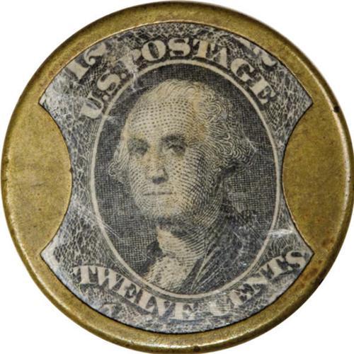<B>HB-135 EP-148 Scott-98 Reed-JG12 12¢ J. Gault Extremely Fine.<BR>Numerical grade: 80case.60stamp.70mica = 210</B></I> A nice example of the most common of the Twelve Cent Encased Postage pieces. The case is problem free, the stamp is a bit dull and it has a light brown stain on Washington's face, and the mica lacks meaningful problems but has heavy surface marks and minor crazes.<BR><I>From The Frederick Mayer Collection</B></I><BR><BR><b>Shipping:</b> Coins & Currency (<a target="_blank" href="http://www.heritageauctions.com/common/shipping.php">view shipping information</a>)