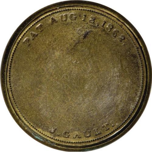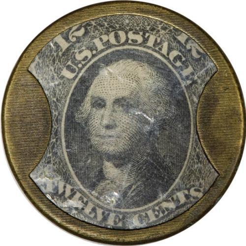 <B>HB-136 EP-149 Scott-98a Reed-JG12RB 12¢ J. Gault Ribbed Frame About New.<BR>Numerical grade: 80case.60stamp.60mica = 200</B></I> The case is handsome and problem free, with pronounced ribbing on the front frame. The stamp is a bit dull, and the mica has a few more crazes and separations than we like to see, although it does remain substantially clear. A very rare variety, with possibly four or five examples known.<BR><I>From The Frederick Mayer Collection</B></I><BR><BR><b>Shipping:</b> Coins & Currency (<a target="_blank" href="http://www.heritageauctions.com/common/shipping.php">view shipping information</a>)
