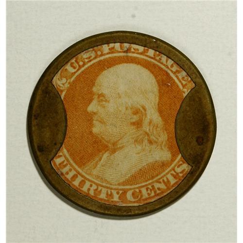 <B>HB-139 EP-178 30¢ J. Gault Plain Frame Choice Extremely Fine.</B></I> A solid case that possesses attractive olive toning holds a nice 30¢ Ben Franklin stamp that still retains much of its original orange color. The mica is almost completely clear with only a couple of minor laminations. A lovely example of this popular issue.<BR><BR><b>Shipping:</b> Coin/Currency (<a target="_blank" href="http://www.heritageauctions.com/common/shipping.php">view shipping information</a>)