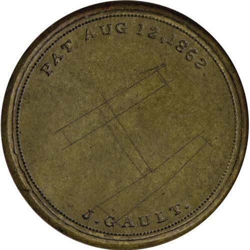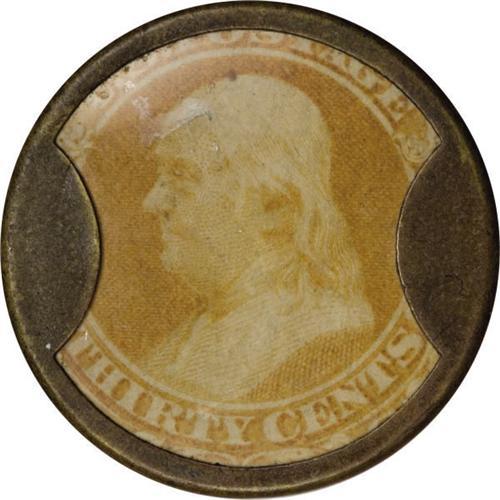 <B>HB-139 EP-178 Scott-100 Reed-JG30 30¢ J. Gault Extremely Fine.<BR>Numerical grade: 50case.75stamp.70mica = 195</B></I> As with the 12¢ and 24¢, this 30¢ J. Gault is among the most common Thirties in the series. However, common in the 30¢ denomination still means pretty darn scarce. Reed considers this piece to be an R-6, indicating sixteen to twenty examples known. We feel twenty or so is probably just about right. This piece would be quite a nice example were it not for a single annoying defect: A large "H" has been lightly scratched into the blank central area of the back. The stamp has somewhat muted color, but it retains decent orange. The mica is clear save for some very minor crazes and a short crack, in the top layer only, at the top of Franklin's forehead.<BR><I>From The Frederick Mayer Collection</B></I><BR><BR><b>Shipping:</b> Coins & Currency (<a target="_blank" href="http://www.heritageauctions.com/common/shipping.php">view shipping information</a>)