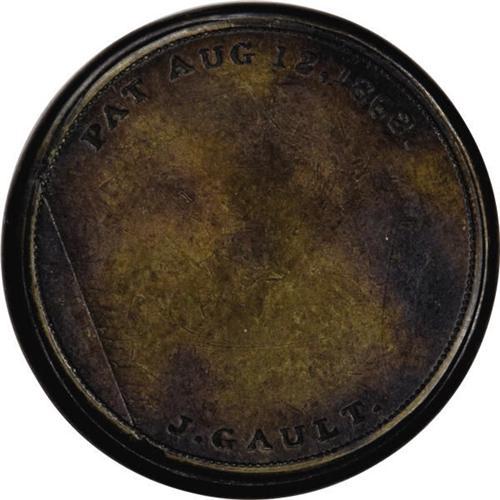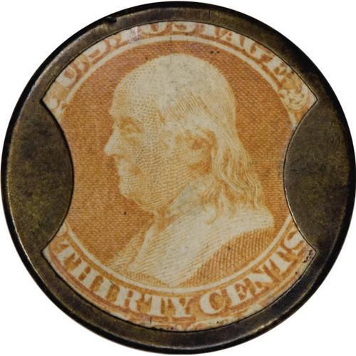 <B>HB-139 EP-178 Scott-100 Reed-JG30 30¢ J. Gault Extremely Fine.<BR>Numerical grade: 65case.80stamp.80mica = 225</B></I> The case has a strange manufacturing defect at its left, where it appears the metal was scored for cutting. It affects only the back portion and not the rim, and is clearly pre-production. Save for that defect, the dark, natural colored case is fully as nice as the exceptional stamp and mica. A common Thirty as a J. Gault, but a rare denomination. This piece was formerly Lot 1082 from the December 1969 Arnold Perl Collection sale, where it was referred to as, "Mica in excellent condition. Very rare, especially so choice."<BR><I>From The Frederick Mayer Collection</B></I><BR><BR><b>Shipping:</b> Coins & Currency (<a target="_blank" href="http://www.heritageauctions.com/common/shipping.php">view shipping information</a>)