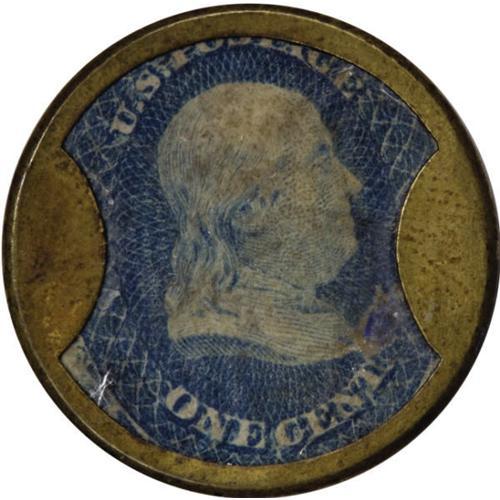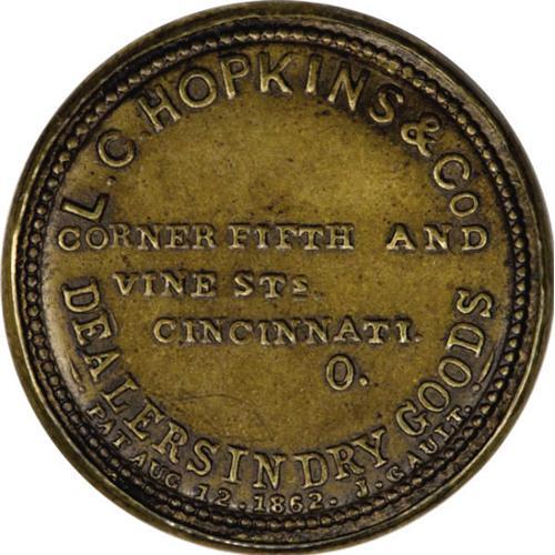 <B>HB-143? EP-17a? Scott-102? Reed-HO01? 1¢ L.C. Hopkins & Co. Very Fine - May Not Be Authentic.<BR>Numerical grade: 60case.60stamp.70mica = 190</B></I> This denomination for this merchant is considered an R-9 by Reed with a question mark, which indicates "Unresolved issues regarding the piece in question." His 104-year auction survey shows six appearances for One Cent Hopkins pieces. Several, if not all, were probably this very piece. While nowhere near as blatant as others in this section, it is simply too irregular and too suspicious to place with the unquestioned pieces in the main section of this catalog. There certainly is a possibility that this piece always was a One Cent Hopkins, but in our opinion, that is not at all a probability. Certainly a five-figure piece if unquestionably genuine. As is, it should sell as a curiosity for several hundred dollars.<BR><I>From The Frederick Mayer Collection</B></I><BR><BR><b>Shipping:</b> Coins & Currency (<a target="_blank" href="http://www.heritageauctions.com/common/shipping.php">view shipping information</a>)