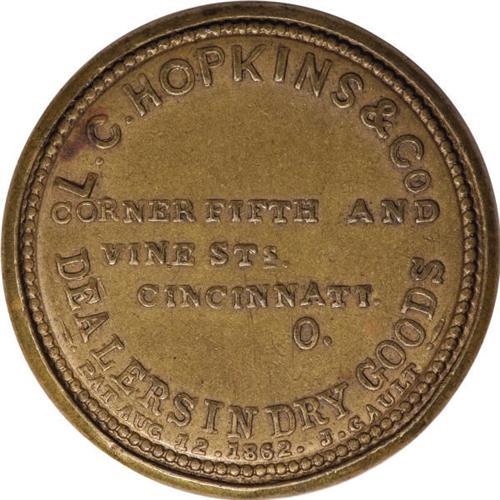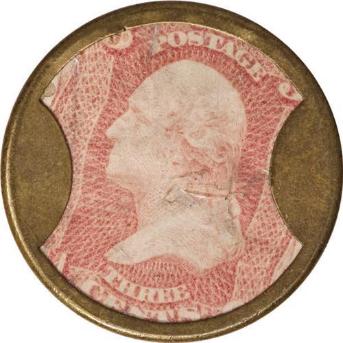 <B>HB-144 EP-48 Scott-103 Reed-HO03 3¢ L.C. Hopkins & Co. Extremely Fine.<BR>Numerical grade: 75case.75stamp.60mica. = 210</B></I> Although the Three Cent is the most common of the Hopkins pieces, it is itself an important rarity, with fewer than eight examples known in all grades. This particular piece is the second finest we know of. The case is a lovely XF, flawless save for a tiny stain at the "C" in L.C. Hopkins; the stamp is well centered and reasonably fresh and the mica primarily clear, though it does have a few cracks and crazes, the worst of which is a chip on Washington's neck. This piece was previously <BR>Lot 311 from the September 1967 Siegel sale of the Lilly Collection.<BR><I>From The Frederick Mayer Collection</B></I><BR><BR><b>Shipping:</b> Coins & Currency (<a target="_blank" href="http://www.heritageauctions.com/common/shipping.php">view shipping information</a>)