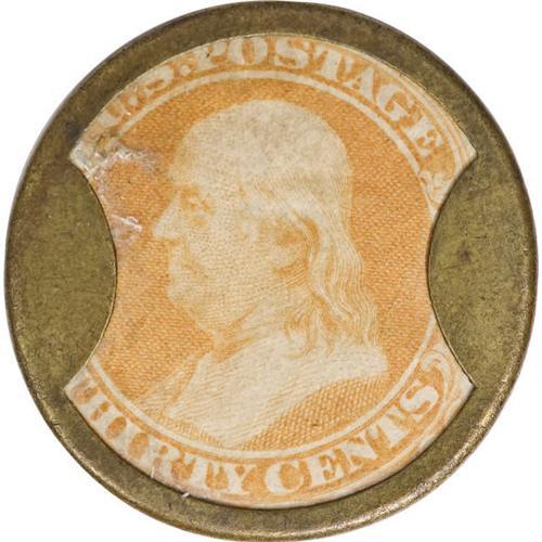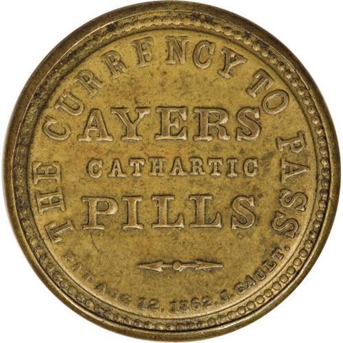 <B>HB-15 EP-unl. Scott-unl. Reed-AC30LA 30¢ Ayer's Cathartic Pills Long Arrows Extremely Fine.<BR>Numerical grade: 80case.75stamp.65mica. = 220</B></I><BR> Listed as unique in Reed, and with only a single auction appearance in his 104-year study. For some reason (typo?) the rarity of this piece is not mentioned in the Hodder-Bowers book, and its price there is less than that of the most common 30 centers. This piece was missing from the Stack's June 2004 sale, and it is very likely the only one in existence. It's a beautiful piece, with an evenly toned medium-brown color to the flawless case. The stamp is fresh and rather well centered, and the mica is perfect over most all of its surface, with just minor crazing at the far left edge in front of Franklin's face. One of the many highlights of Mr. Mayer's incomparable Encased collection, and a piece that he acquired at nearly $4000 many, many years ago.<BR><I>From The Frederick Mayer Collection</B></I><BR><BR><b>Shipping:</b> Coins & Currency (<a target="_blank" href="http://www.heritageauctions.com/common/shipping.php">view shipping information</a>)