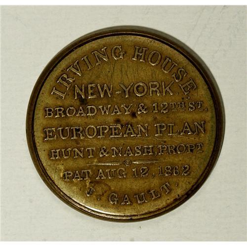 <B>HB-151 EP-81 5¢ Hunt & Nash Irving House Extremely Fine.</B></I> A somewhat less common denomination of this issuer, and quite a nice piece. The mica exhibits only a few natural flaws and no circulation damage, the stamp is reasonably bright and the case is almost free of wear. The back of the case has some very minor scratching that is visible only when the case is viewed at exactly the right (or wrong?) angle.<BR><BR><b>Shipping:</b> Coin/Currency (<a target="_blank" href="http://www.heritageauctions.com/common/shipping.php">view shipping information</a>)