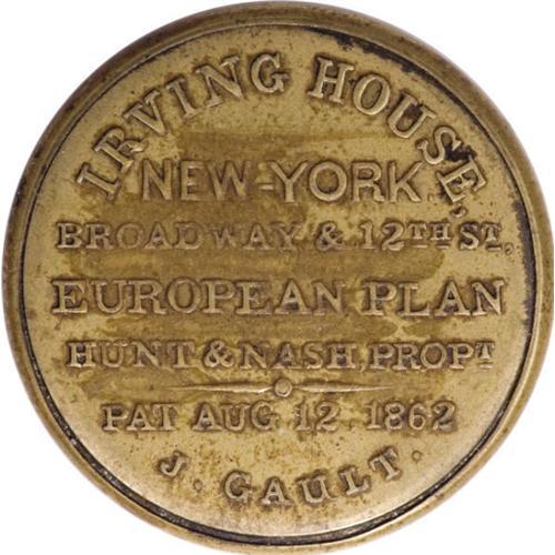<B>HB-153 EP-118 Scott-109 Reed-IH10 10¢ Irving House - Hunt & Nash Extremely Fine.<BR>Numerical grade: 75case.60stamp.75mica. = 210</B></I> This Ten Cent plain frame Irving House is considerably rarer than its Ribbed Frame counterpart. Fred Reed considers it an R-8+, indicating five to seven known, a number with which we agree. In auction appearance over a 104-year period, there have been 33 appearances of Ten Cent Plain Frame Irving House pieces and 73 appearances of Ribbed Frame examples. These numbers of course include massive duplication, but they serve very nicely to show proportionate rarity. This piece has a back with the typical light brass Irving House color, though it is somewhat darker toward the middle. The stamp has two light stains, and it is a bit soiled. The mica is problem free and quite nice. The back is assembled upside down relative to the face. This is seen throughout Encased Postage, but it is much more common on Irving House than on any others.<BR><I>From The Frederick Mayer Collection</B></I><BR><BR><b>Shipping:</b> Coins & Currency (<a target="_blank" href="http://www.heritageauctions.com/common/shipping.php">view shipping information</a>)