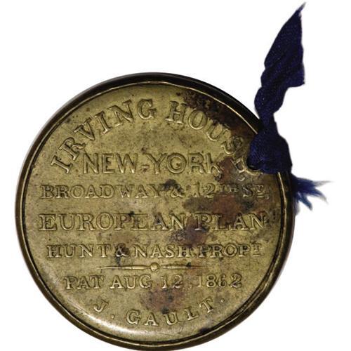 <B>HB-153 Reed-IH10ES Experimental 10¢ 1851 Envelope Stamp Irving House, Hunt & Nash Very Fine.</B></I><BR> This enigmatic and likely experimental piece is noted on the flip by Mr. Mayer as, "Perl to Hearst." It was later part of the Dr. Robert Gardner collection, and we presume it was purchased by Mr. Mayer when that collection was dispersed. <BR>Both sides are illustrated on page 85 of Fred Reed's book. Irving House was Gault's earliest customer, and it is likely that this piece was prepared by Scovill as a sample for Gault to show Hunt & Nash. The piece has clearly circulated, in spite of the fact that the stamp was demonetized at the start of the Civil War. Even were it not, it still would have been rendered valueless, as envelope stamps were neither redeemable nor valid for postage once cut from the envelope on which they were printed. Ten cents was a fair amount of money in 1862, and it is very unlikely that any member of the public would have had the savvy to reject this piece as having a non-valid stamp. After its use as a "trial" or "experimental," it was likely simply spent. The piece is clearly genuine and untampered with. Another strong possibility is that this was a patent model that was submitted by Gault to the patent office and subsequently sold by them. Items in the patent office were tagged by tying with ribbon. A small item, such as this, would have been holed and tied. Adding to its enigmatic status is the fact that it has been holed and has a ribbon knotted through the hole. No one knows the precise origin, date of production or purpose of production for the handful of Encased Postage pieces that fall into the "trial," "experimental" or "specimen" category. Pieces such as this, with a clearly genuine back that was part of Gault's production, are particularly interesting to collectors. A difficult item to estimate, but similar pieces in the Stack's '04 sale and our sale of last January realized in the $2000 to $6000 range. This piece certainly belongs at the upper end.<BR><I>From The Frederick Mayer Collection</B></I><BR><BR><b>Shipping:</b> Coins & Currency (<a target="_blank" href="http://www.heritageauctions.com/common/shipping.php">view shipping information</a>)