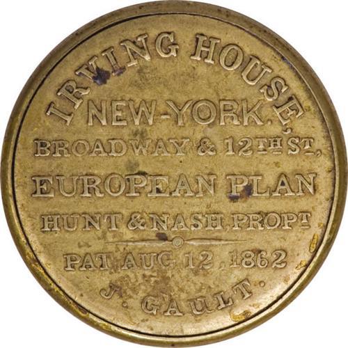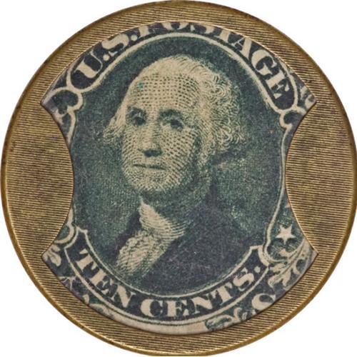 <B>HB-154 EP-119 Scott-109a Reed-IH10RB 10¢ Irving House - Hunt & Nash Ribbed Frame About New.<BR>Numerical grade: 75case.70stamp.80mica. = 225</B></I> The second of Mr. Mayer's five HB-154's. Again, with a fully upright back. The stamp is a bit toned but quite acceptable, and the mica is exceptional, with only the most minor separations visible at certain angles of light.<BR><I>From The Frederick Mayer Collection</B></I><BR><BR><b>Shipping:</b> Coins & Currency (<a target="_blank" href="http://www.heritageauctions.com/common/shipping.php">view shipping information</a>)