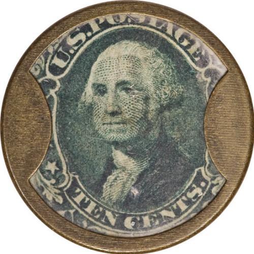 <B>HB-154 EP-119 Scott-109a Reed-IH10RB 10¢ Irving House - Hunt & Nash Ribbed Frame Extremely Fine.<BR>Numerical grade: 80case.70stamp.75mica. = 225</B></I> This piece, Mr. Mayer's third example of the type, has the inverted reverse that is far more commonly found on Irving House than on any other merchant. The case is problem free, with the light brass "Irving House" color. The stamp is a hair dull, and the mica is above average with only very minor flaws.<BR><I>From The Frederick Mayer Collection</B></I><BR><BR><b>Shipping:</b> Coins & Currency (<a target="_blank" href="http://www.heritageauctions.com/common/shipping.php">view shipping information</a>)