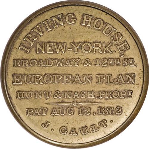 <B>HB-154 EP-119 Scott-109a Reed-IH10RB 10c Irving House - Hunt & Nash Ribbed Frame Extremely Fine.</B></I><BR> This piece, Mr. Mayer's last example of the type, has the inverted reverse that is far more commonly found on Irving House than on any other merchant. The case is problem free, with the light brass "Irving House" color. The stamp is a hair dull, and the mica is above average with only very minor flaws.<BR><I>From The Frederick R. Mayer Collection</B></I><BR><BR><b>Shipping:</b> Coins & Currency (<a target="_blank" href="http://www.heritageauctions.com/common/shipping.php">view shipping information</a>)