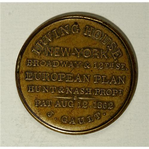 <B>HB-156 EP-151 12¢ Irving House Hunt & Nash - Ribbed Frame Very Fine.</B></I> An extremely rare piece, with only three examples known, two of which are in this sale. This piece is tightly closed, problem-free and as-made beyond any suspicion. The case is a natural light brass color, which is commonly seen for this merchant. The mica is virtually perfect, and the black 12¢ stamp remains bright and vivid. Another major rarity from this spectacular collection.<BR><BR><b>Shipping:</b> Coin/Currency (<a target="_blank" href="http://www.heritageauctions.com/common/shipping.php">view shipping information</a>)