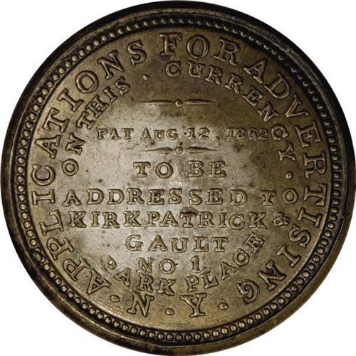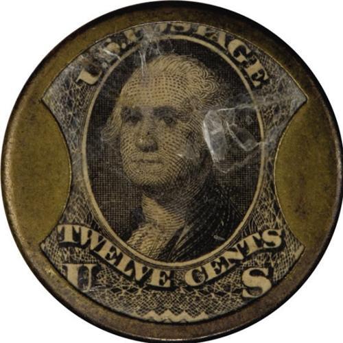 <B>HB-164 EP-152 Scott-117 Reed-KG12 12¢ Kirkpatrick & Gault About New.<BR>Numerical grade: 80case.75stamp.50mica. = 205</B></I> The Kirkpatrick & Gault 12¢ is rated an R-8 by Reed, indicating five to ten examples known. This piece, which was previously Lot 1075 from the 1969 sale of the Arnold Perl Collection, has a lovely high-end case, with considerable silvering remaining at the center. The stamp is centered a bit high and it’s slightly aged, and the mica has some separations and two chipped areas where the upper layers of mica are missing, but the lower layers remain intact.<BR><I>From The Frederick Mayer Collection</B></I><BR><BR><b>Shipping:</b> Coins & Currency (<a target="_blank" href="http://www.heritageauctions.com/common/shipping.php">view shipping information</a>)