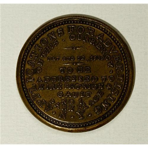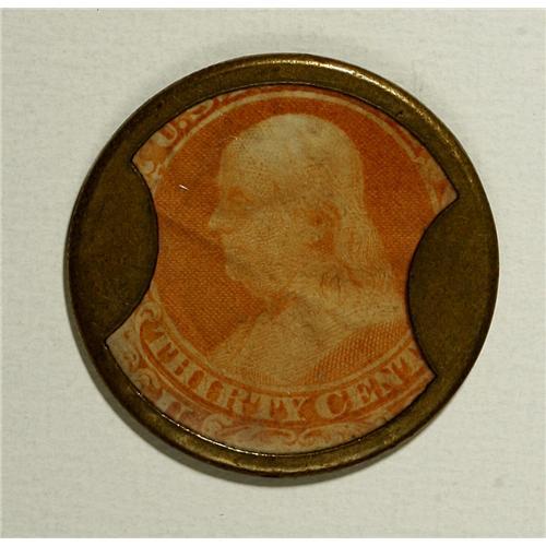 <B>HB-166 EP-181 30¢ Kirkpatrick & Gault Extremely Fine.</B></I> All 30¢ Encased Postage pieces are rare and highly desirable. This Kirkpatrick & Gault example is one of the more common pieces of the denomination, with about fifteen examples known. As with all high-denomination encasements, genuineness is of paramount concern. This piece is above suspicion, with a tightly sealed, perfectly formed case all the way around. The case itself is problem-free, the orange 30¢ stamp remains beautifully bright and the mica approaches perfection. There are a few as-made wrinkles in the stamp, but they do nothing to detract from this highly important piece.<BR><BR><b>Shipping:</b> Coin/Currency (<a target="_blank" href="http://www.heritageauctions.com/common/shipping.php">view shipping information</a>)