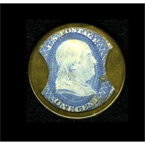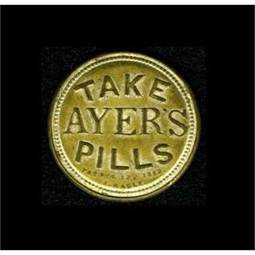 <B>HB-17 EP-3 1¢ Take Ayer's Pills Extremely Fine.</B></I> A 100% brilliant blue stamp combines with a light brass colored case. There is a fair amount of silvering remaining between the letters. The mica is perfect save for a few extremely minor craze marks at the bottom right. A rather common example, ideal to represent the type or denomination.<BR><BR><b>Shipping:</b> Coin/Currency (<a target="_blank" href="http://www.heritageauctions.com/common/shipping.php">view shipping information</a>)