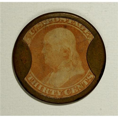 <B>HB-174 EP-182 30¢ Lord & Taylor Choice Extremely Fine.</B></I> In the Hodder-Bowers book, the authors point out that this 30¢ Lord & Taylor is even rarer than the 90¢. They comment, "The great rarity from this commissioner is the 30¢ denomination, of which only one or two examples are known." They go on to say, " We know of only one complete collection of Lord & Taylor encasements." The complete collection was sold by Stack's in June of 2004, where this piece was acquired by our consignor as Lot 552. The case is a natural, glossy light mahogany, utterly defect-free and with considerable claim to the About New grade. The stamp is lightly faded but well centered, with the orange color remaining strong. The mica is as perfect as these are ever seen. An extraordinary rarity that should certainly realize...<BR><BR><b>Shipping:</b> Coin/Currency (<a target="_blank" href="http://www.heritageauctions.com/common/shipping.php">view shipping information</a>)