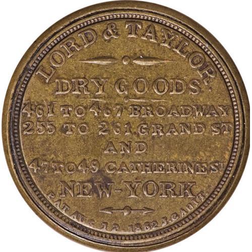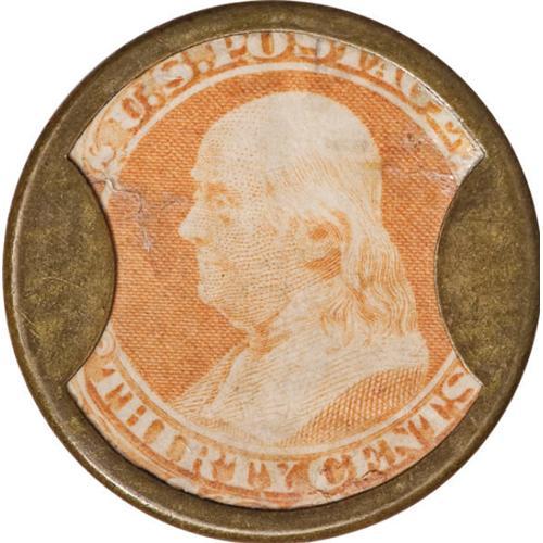 <B>HB-174 EP-182 Scott-127 Reed-LT30 30¢ Lord & Taylor Extremely Fine.<BR>Numerical grade: 75case.75stamp.55mica. = 205</B></I> A 30¢ Lord & Taylor is an R-9 in Reed. The R-9 designation is two to four known. In our opinion, the correct number is three, two of which are in this collection. Exact counts are very challenging when high denomination pieces are concerned, as a pretty fair number of obvious fakes continually crosses the auction block from early in the last century until 1960 or so, when buyers became, by and large, more savvy and cautious. We are positive of the existence of only two genuine examples: the two being offered here. One of them was the Stack's June 2004 example, from a prominent western collection, which Mr. Mayer purchased in the aftermarket. Beyond these two, we have seen one other that we like. This piece has an attractive, problem-free case with a perfect closure. The stamp is bright orange and just a hair toned in its white portions. The mica has some surface marks, three small cracks and a break above the right tab that exposes a tiny portion of the stamp.<BR><I>From The Frederick Mayer Collection</B></I><BR><BR><b>Shipping:</b> Coins & Currency (<a target="_blank" href="http://www.heritageauctions.com/common/shipping.php">view shipping information</a>)