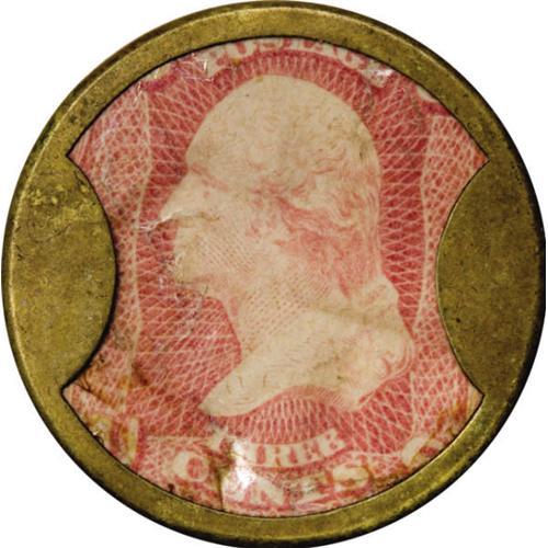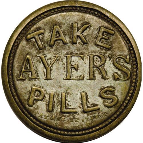 <B>HB-18 EP-33 Scott-9 Reed-AP03 3¢ Take Ayer's Pills About New.</B></I> The case has over 70% of its original silvering remaining and is totally problem-free. The stamp is bright, and very well centered in the case. The mica is the weak point of this otherwise very nice piece with some surfaces problems, cracks, and crazes. <BR><BR><b>Shipping:</b> Coins & Currency (<a target="_blank" href="http://www.heritageauctions.com/common/shipping.php">view shipping information</a>)