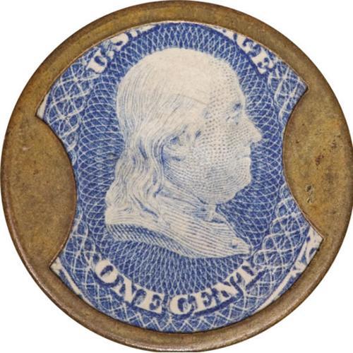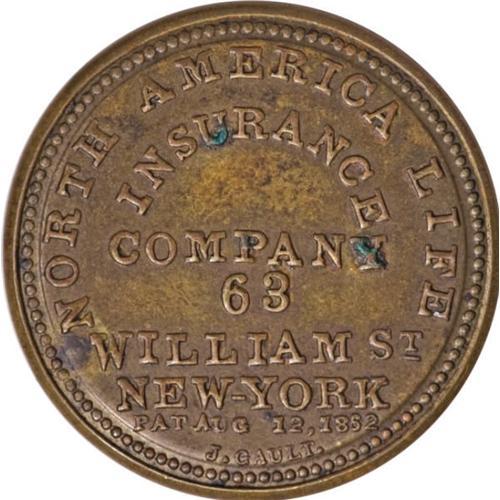 <B>HB-189 EP-24a Scott-140 Reed-NA01CU 1¢ North America Life Insurance Curved Insurance Extremely Fine<BR>Numerical grade: 75case.90stamp.90mica. = 255</B></I> The scarcer of the two 1¢ varieties, and a very nice example. The case is mahogany, with great detail. The mica is crystal clear and essentially flawless, as good as any we've seen, and the stamp has brilliant color and is quite nicely centered. Save for two minor corrosion spots, one on the "U" of "INSURANCE" and one on the "Y" of company, this would be one of the finest condition pieces in this sale. Even with those minor flaws, this one is still in the top twenty.<BR><I>From The Frederick Mayer Collection</B></I><BR><BR><b>Shipping:</b> Coins & Currency (<a target="_blank" href="http://www.heritageauctions.com/common/shipping.php">view shipping information</a>)