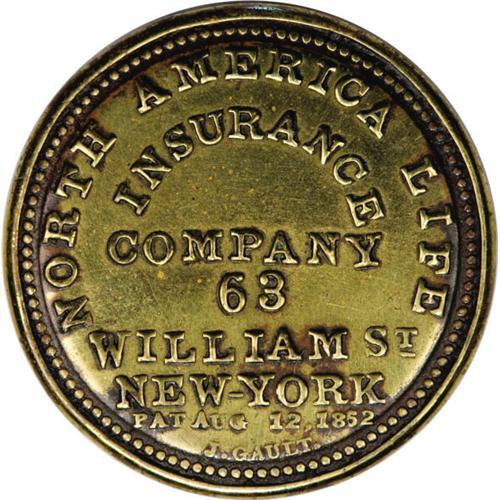 <B>HB-200 EP-155a Scott- unl. Reed-NA12CU 12c North America Life Insurance Curved Insurance Very Fine</B></I>. Unlisted in any of the reference works prior to the 1989 Hodder-Bowers book, Reed reports two auction appearances of this number in his 104-year survey, but he question-marks the piece in his rarity table. The HB book listed this encasement as they knew of its existence in the Western Collection. When that collection was sold by Stack's in June of 2004, this piece appeared as Lot 582. Although it is highly polished, the Stack's '04 sale mentions that this encasement came to the Western Collection by way of the Boyd Collection rather than that of Clarke. While that pedigree is likely correct, it seems possible that Boyd obtained the encasement from Clarke, as these highly polished cases were Clarke's handiwork. The piece has now been listed by Friedberg and assigned a number. We believe it to be unique, as did Hodder-Bowers. The Stack's June '04 catalog said, "Probably unique: we have no records of another, and have not heard of even a rumor of one." The case on this example is highly polished, the stamp is the best feature: it's quite fresh and beautifully centered. The mica is above average, with just minor crazing at its outer edges and a few small separations visible under angled light. An extremely important piece.<BR><I>From The Frederick R. Mayer Collection</B></I><BR><BR><b>Shipping:</b> Coins & Currency (<a target="_blank" href="http://www.heritageauctions.com/common/shipping.php">view shipping information</a>)