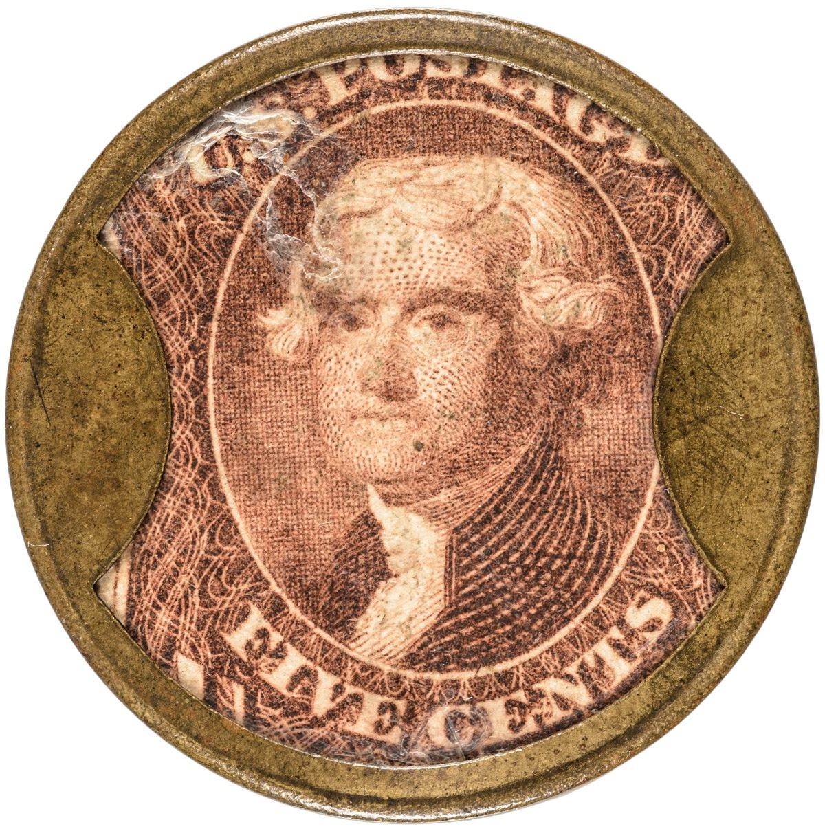 Description: Rated as Rarity-8 (5 to 10 known) according to Fred Reed. A truly outstanding example of this Exceedingly Rare major Merchant type. It is an important “Key” to the completion of any Complete 34 Merchant Type Set. The Thomas Jefferson stamp remains in original deep brown color under mostly clean, clear mica, with one light area of surface lamination craze near the top left edge, being above Jefferson’s temple. The case remains absolutely natural and truly beautiful in appearance and almost no indications of any circulation. There remains significant underlying original luster on the reverse and hardly any sign of actual wear to the case itself. A specimen for premium quality minded collectors. Ex: Early American History Auction, August 27, 2005, Lot 853, where it sold for $7,670. Outstanding and perhaps the very Finest .