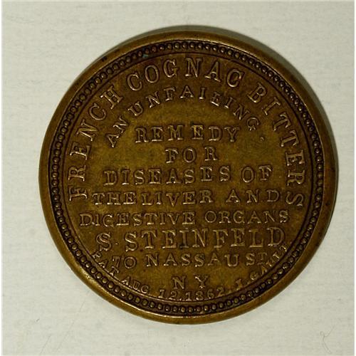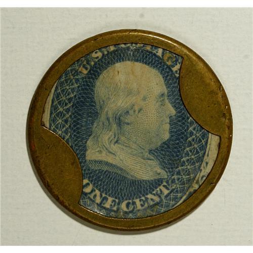<B>HB-221 EP-27 1¢ S. Steinfeld About New.</B></I> Steinfeld is one of the key pieces to a merchant set of encased postage, with fewer than 20 known examples for all denominations combined. The great majority of these are of this 1¢ denomination. No 3¢ is known, and the 5¢, 10¢ and 12¢ are all considered to be unique. The case is fully About New, with a bit of original color visible between the letters. The mica is essentially perfect, without any disturbances, natural or circulation-caused. The stamp is very lightly toned in its white sections, although the blue remains vivid. A premium example of a key piece.<BR><BR><b>Shipping:</b> Coin/Currency (<a target="_blank" href="http://www.heritageauctions.com/common/shipping.php">view shipping information</a>)