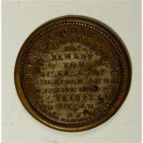 <B>HB-221 EP-27 1¢ S. Steinfeld About New.</B></I> A spectacular quality piece, with a beautiful blue stamp, a near-perfect mica and a high-quality case with gorgeous color and much of its silvering remaining. This is the only collectable denomination of this very rare merchant. It was previously Lot 607 of Stack's June 2004 sale. Prior to that, it was lot 123 of Herman Herst's December 3, 1965 sale.<BR><BR><b>Shipping:</b> Coin/Currency (<a target="_blank" href="http://www.heritageauctions.com/common/shipping.php">view shipping information</a>)