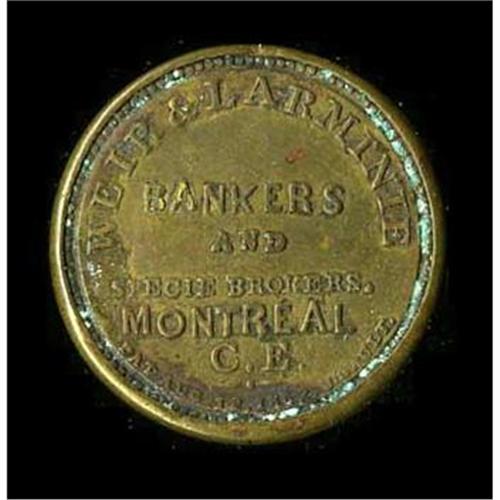 <B>HB-233 EP-133 10¢ Weir & Larminie Very Fine.</B></I> This is quite a scarce merchant, with fewer than fifty examples known in total for all denominations combined. This Ten Cent denomination is far and away the most common. Most of the pieces we have handled over the years are very high grade (from a standpoint of wear) but are corroded at the edges of the back from moisture. This piece has received a fair amount of circulation ware but is without the normal damage. The case is a light even tan, the mica has a number of cracks and crazes, and the stamp is reasonably bright.<BR><BR><b>Shipping:</b> Coin/Currency (<a target="_blank" href="http://www.heritageauctions.com/common/shipping.php">view shipping information</a>)