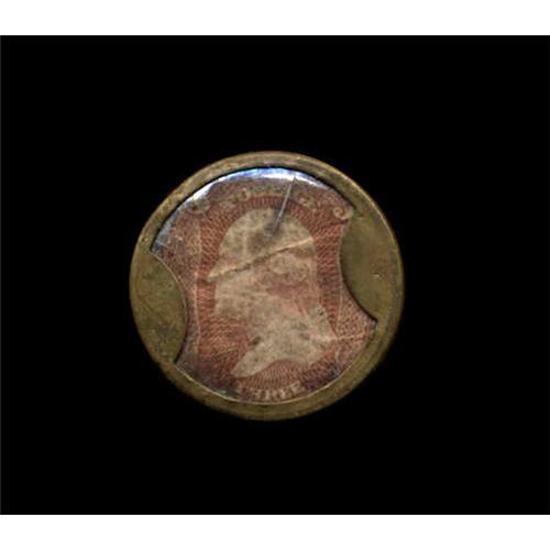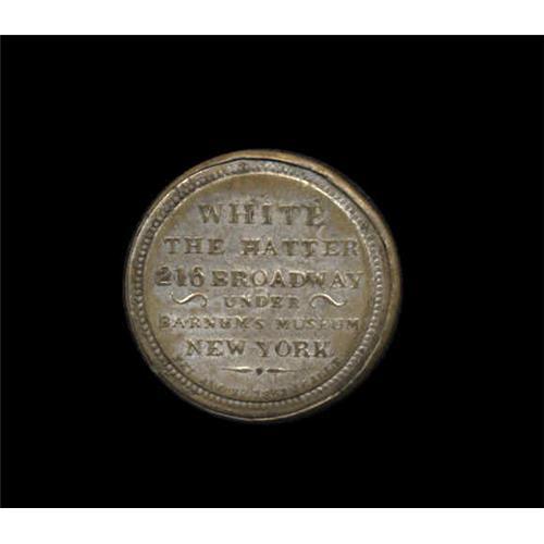 <B>HB-235 EP-59 3¢ White the Hatter Extremely Fine.</B></I> Our grade refers to the degree of wear on the case, as always, and not the overall condition of the piece. In this instance, the case shows almost no wear, retaining approximately 80% of its silvering. The stamp is quite soiled, and the mica has several disturbances, including one fairly bad crack. It appears to us that the case has been opened and re-closed, as there is considerable crimping at the seam. In any event, White the Hatter is one of the rarest Encased Postage merchants, with fewer than two dozen known pieces for all denominations combined. Due to the possible tampering, this piece is offered, "as is" with no return privilege.