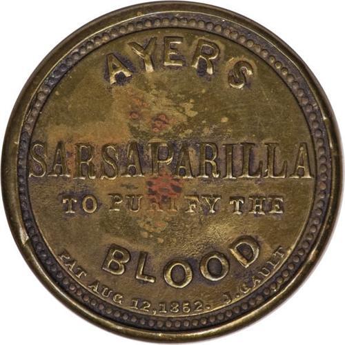 <B>HB-27 EP-4 Scott-13a Reed-AS01SM 1¢ Ayer's Sarsaparilla Small Ayer's Very Fine.<BR>Numerical grade: 60case.60stamp.75mica. = 195</B></I><BR> Cleaned at one time, and still with a predominantly bright brass glare. The stamp is fairly fresh as well, although with a wrinkle, and the mica is just about perfect. An acceptable example of this R-4 piece. Attributed by Mr. Mayer to Stack's sale of the Arnold Perl Collection.<BR><I>From The Frederick Mayer Collection</B></I><BR><BR><b>Shipping:</b> Coins & Currency (<a target="_blank" href="http://www.heritageauctions.com/common/shipping.php">view shipping information</a>)