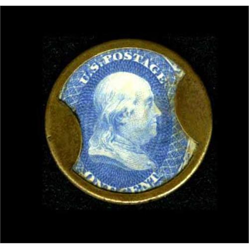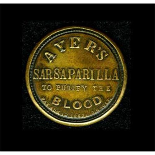 <B>HB-28 EP-4a 1¢ Ayer's Sarsaparilla About New.</B></I> The case is a very attractive mahogany brown with near-flawless surfaces. The mica is about as perfect as these ever come, and the stamp has retained all its bright blue color. This piece was purchased a long time ago from Stack's for $9. <BR><I>From The Collection of Louis E. Eliasberg, Sr.</B></I><BR><BR><b>Shipping:</b> Coin/Currency (<a target="_blank" href="http://www.heritageauctions.com/common/shipping.php">view shipping information</a>)