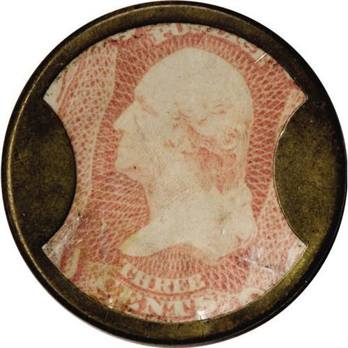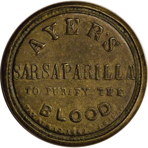 <B>HB-30 EP-34a Scott-15a Reed-AS03MD 3¢ Ayer's Sarsaparilla Medium Ayer's Very Fine.</B></I> A decent problem-free example of this common encasement. The stamp is a trifle faded, and the mica shows some minor crazing and one short crack.<BR><BR><b>Shipping:</b> Coins & Currency (<a target="_blank" href="http://www.heritageauctions.com/common/shipping.php">view shipping information</a>)