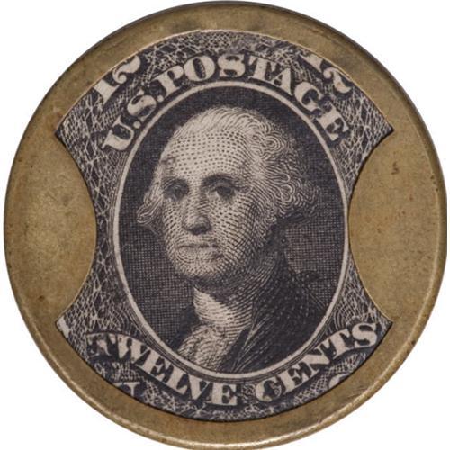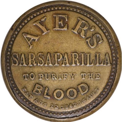 <B>HB-41 EP-unl. Scott-unl. Reed-AS12LG 12¢ Ayer's Sarsaparilla Large Ayer's Extremely Fine.<BR>Numerical grade: 75case.70stamp.90mica. = 235</B></I> Missing from all the major collections, and one of only two examples known to us. The Western Collection lacked a Large Ayer's 12¢, and there was none in Dunham, Lilly or Perl. Reed shows the earliest auction appearance for this type as 1905, and only three appearances throughout the length of his auction data. Mr. Mayer was never able to obtain one until this piece appeared in a 2005 Lyn Knight auction. At that sale, he paid $7187.50 for this attractive piece. The case is fully XF, tightly closed and problem free. The mica and stamp are both extremely nice, the mica being virtually faultless.<BR><I>From The Frederick Mayer Collection</B></I><BR><BR><b>Shipping:</b> Coins & Currency (<a target="_blank" href="http://www.heritageauctions.com/common/shipping.php">view shipping information</a>)
