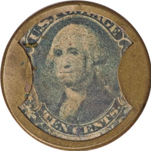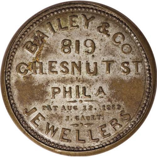 <B>HB-47 EP-100 Scott-24 Reed-BC10 10¢ Bailey & Co. Extremely Fine.<BR>Numerical grade: 60case.50stamp.80mica. = 190</B></I> A considerable amount of silvering remains on the back of the case. The front has a small dent at the top center and a little bending of the left tab. The mica is excellent and virtually flaw free; the stamp is rather heavily aged, and it shows a few spots and a bit of soiling.<BR><I>From The Frederick Mayer Collection</B></I><BR><BR><b>Shipping:</b> Coins & Currency (<a target="_blank" href="http://www.heritageauctions.com/common/shipping.php">view shipping information</a>)
