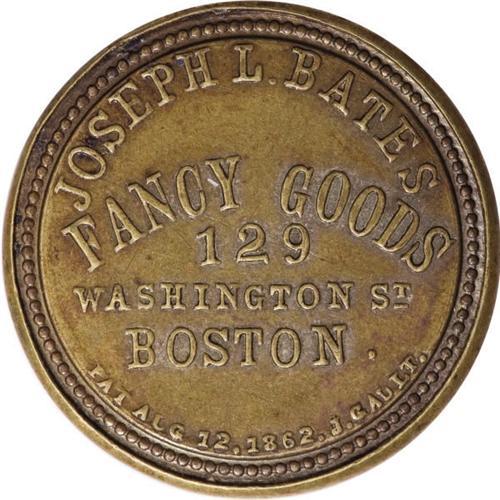 <B>HB-50 EP-6 Scott-26a Reed-BA01F/G 1¢ Joseph L. Bates Fancy Goods Choice About New.<BR>Numerical grade: 85case.70stamp.90mica. = 245</B></I> This One Cent piece with "FANCY GOODS" as two words is by far the most common of any of the Bates pieces. The One Cent denomination is the only easily obtained denomination for Bates, and the two-word "FANCY GOODS" is far more common than the one-word. Reed rates this piece as an R-4, indicating 31 to 40 known, a figure with which we agree. The case itself is a glossy medium-brown About New with a touch of silver behind many of the letters. The stamp is beautifully fresh but somewhat off center to the upper right. The mica is about as close to flawless as these ever come. A wonderful condition piece.<BR><I>From The Frederick Mayer Collection</B></I><BR><BR><b>Shipping:</b> Coins & Currency (<a target="_blank" href="http://www.heritageauctions.com/common/shipping.php">view shipping information</a>)