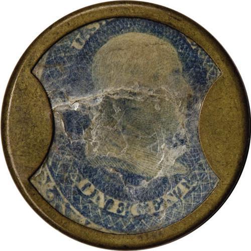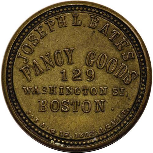 <B>HB-50 EP-6 Scott-26a-Reed BA01F/G 1¢ Joseph L. Bates Fancy Goods Extremely Fine.</B></I> This is the variety with "Fancy Goods" as two words. Considered to be a R-4 by Reed (31-40 known) and we agree. The case is a solid XF with a nice medium golden-tan color. The stamp is a bit soiled, and the mica, unfortunately, is heavily cracked and crazed--particularly through the center. <BR><BR><b>Shipping:</b> Coins & Currency (<a target="_blank" href="http://www.heritageauctions.com/common/shipping.php">view shipping information</a>)