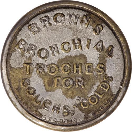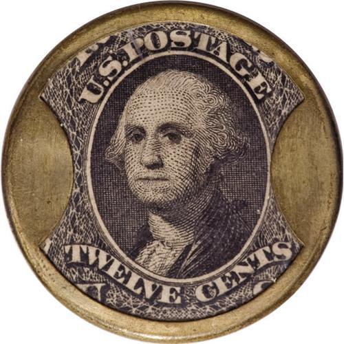 <B>HB-66 EP-140 Scott-35 Reed-BT12 12¢ Brown's Bronchial Troches About New<BR>Numerical grade: 75case.70stamp.75mica. = 220</B></I> This high-end case has about 50% of its silvering remaining. Interestingly, the missing silvering does not seem to have worn off, but rather it appears as though it was never applied, as the silver is missing in large patches. The areas where the silvering is present have definitive edges. The stamp is reasonably fresh and the mica crystal clear, with just a few minor laminations at the very top. This Twelve Cent Brown's is about equal in rarity to the One Cent. Fred Reed rates it as an R-9, indicating two to four known. The Hodder-Bowers reference states, "Fewer than ten." The Stack's June 2004 sale had an example, and other than that piece and this one, we have seen no others. The Stack's example realized $4000.<BR><I>From The Frederick Mayer Collection</B></I><BR><BR><b>Shipping:</b> Coins & Currency (<a target="_blank" href="http://www.heritageauctions.com/common/shipping.php">view shipping information</a>)