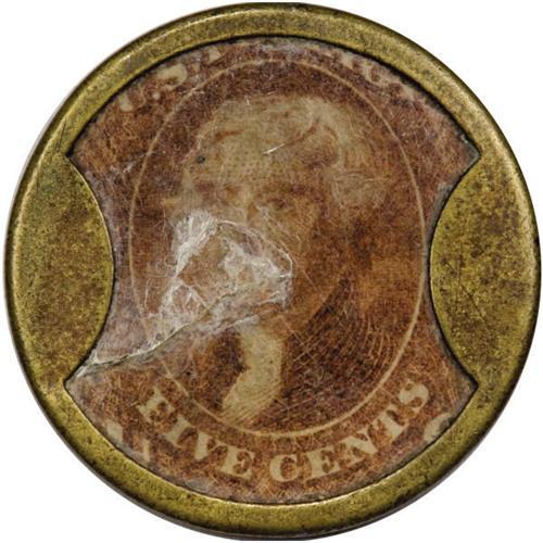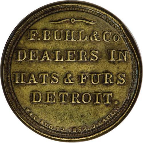 <B>HB-69 EP-68 Scott-40 Reed-BU01 1¢ F. Buhl & Co. Extremely Fine.<BR>Numerical grade: 60case.40stamp.30mica. = 130</B></I> A rare piece, with fewer than ten examples known. The case has little circulation, but it's bruised at the upper right. The stamp is a hair dark, and the mica has some cracks and a disturbing craze mark over the lower half of the portrait.<BR><I>From The Frederick Mayer Collection</B></I><BR><BR><b>Shipping:</b> Coins & Currency (<a target="_blank" href="http://www.heritageauctions.com/common/shipping.php">view shipping information</a>)