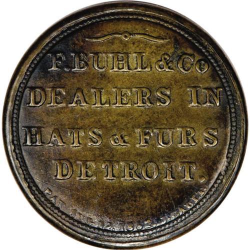 <B>HB-70 EP-104 Scott-41 Reed-BU10 10c F. Buhl & Co. Extremely Fine.</B></I><BR> An exceptionally high-end piece for this merchant, which typically comes well used, and often with problems. It was previously Lot 1045 from the Stack's 1969 sale of the Arnold Perl Collection where it was described, "Extremely Fine. Mica quite perfect. Rare, especially in this state of preservation." All of which we agree with. The case is a glossy, deep mahogany brown with no problems, the stamp is fresh and attractive, and the mica is as close to perfect as is ever seen. One of the finest Buhls in existence.<BR><I>From The Frederick R. Mayer Collection</B></I><BR><BR><b>Shipping:</b> Coins & Currency (<a target="_blank" href="http://www.heritageauctions.com/common/shipping.php">view shipping information</a>)