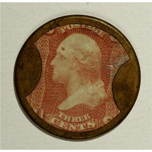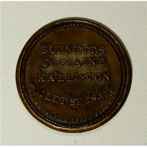 <B>HB-74 EP-39 3¢ Burnett's Cocoaine Kalliston Extremely Fine.</B></I> A tiny trace of silver remains at the central portion of the case, which shows very little actual circulation. The stamp is fully bright, and the mica's only flaw is some minimal crazing at the far right behind Washington's head.<BR><BR><b>Shipping:</b> Coin/Currency (<a target="_blank" href="http://www.heritageauctions.com/common/shipping.php">view shipping information</a>)
